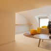 Cinque scalini portano ad un soggiorno con soffitto a volta, in un ambiente molto cozy ad accogliente.
