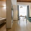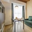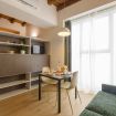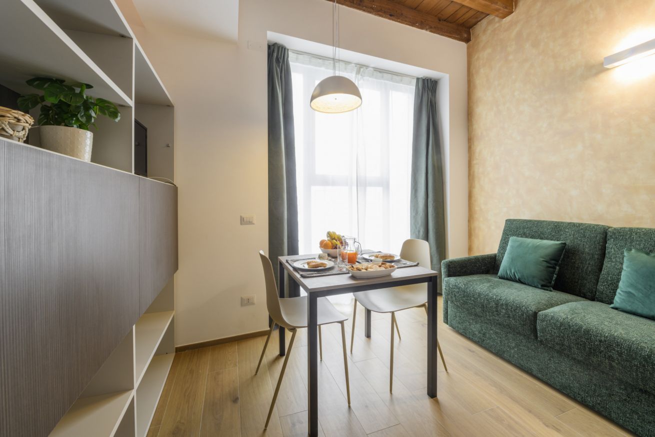 La zona giorno, luminosa e curata, comprende un tavolo da pranzo e una smart TV per rilassarsi dopo una giornata in città o una serata nei locali del quartiere.