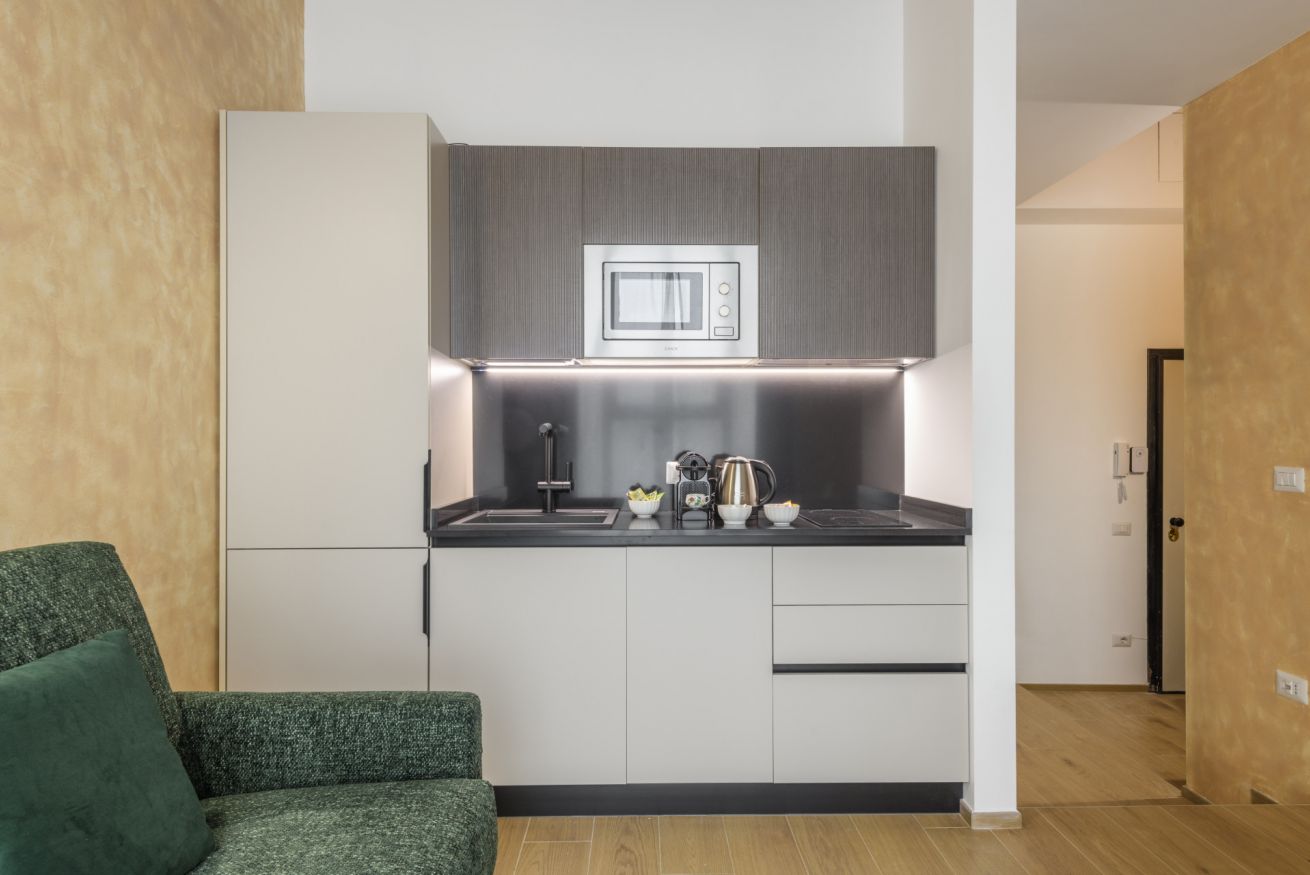La cucina completamente attrezzata dispone di tutto il necessario per cucinare come a casa: piano cottura, forno a microonde, frigorifero con freezer, bollitore, macchina del caffè, lavastoviglie e stoviglie. Perfetta per iniziare la giornata con un buon caffè o preparare una cena prima di uscire a scoprire la movida milanese.