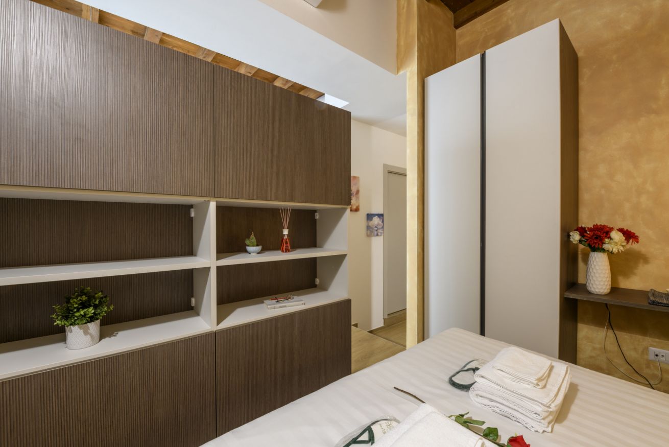 La zona notte offre un ambiente tranquillo con letto matrimoniale queen, ampi armadi e arredi essenziali pensati per garantire il massimo comfort.