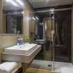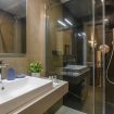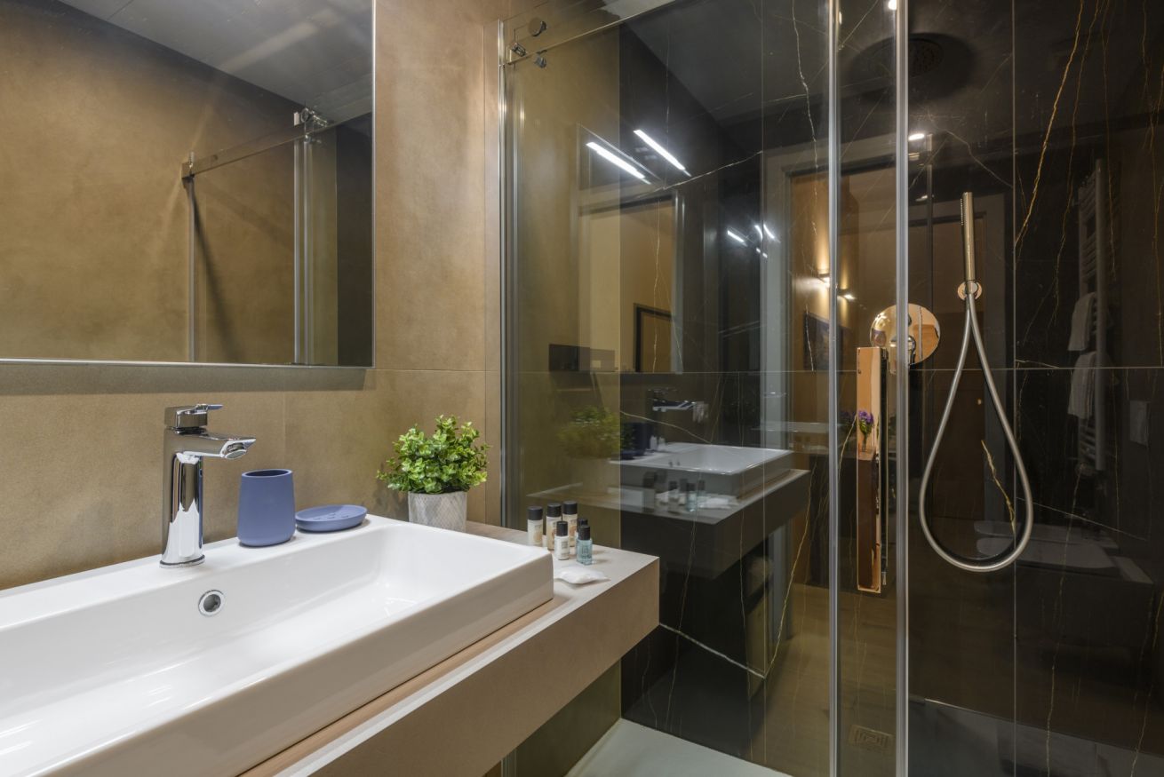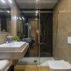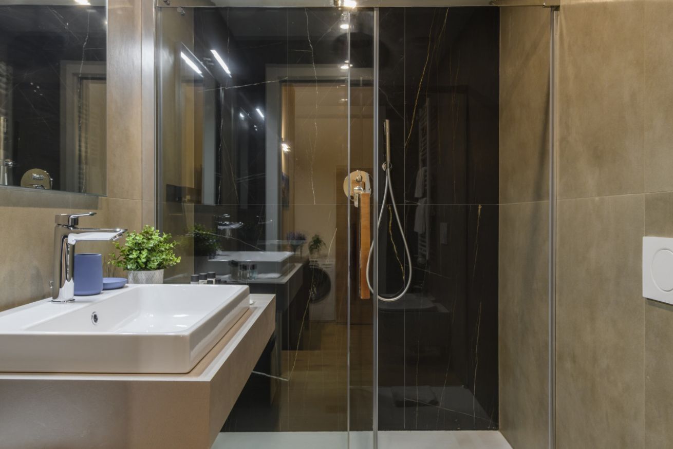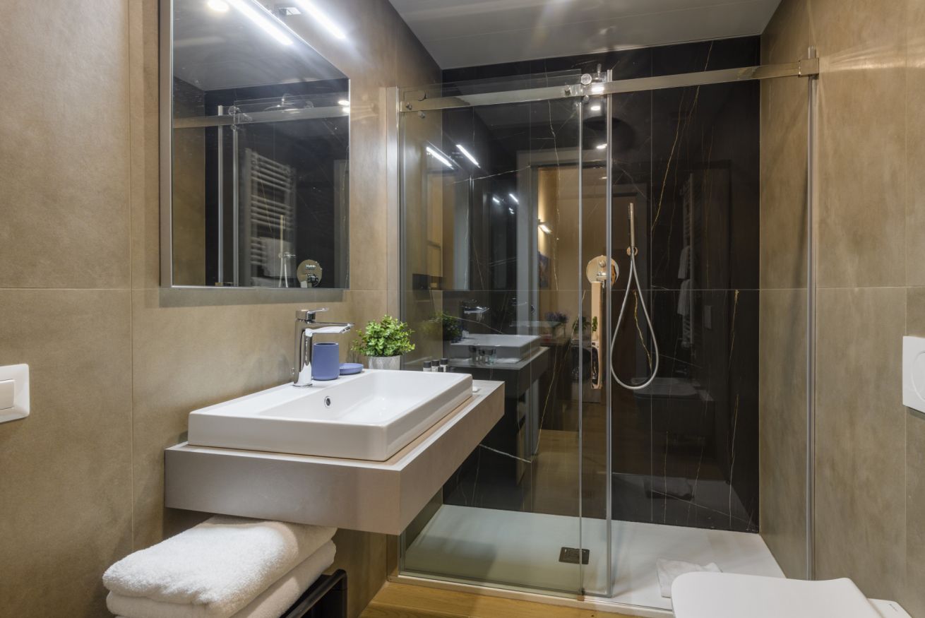Il bagno moderno è dotato di doccia spaziosa, asciugacapelli e set di asciugamani puliti.