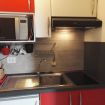 Nell'angolo cottura trovate un frigorifero sottopiano, i fuochi, un forno a microonde, un bollitore e la lavatrice.