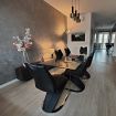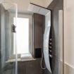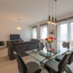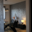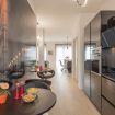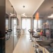 L'arredo è di una sobria eleganza senza tempo ravvivata dai riflessi argentei delle pareti a colore. Completa il fascino dell'appartamento la gigantografia della Galleria Vittorio Emanuele II, che ricopre un'intera parete dell'elegante ambiente cucina e con un tocco di “magia”, come se si entrasse in un film, lo trasforma in un suggestivo locale della Galleria, cuore pulsante della storia milanese, con i suoi tavolini e i suoi sgabelli regolabili, dove gustare a qualsiasi ora cappuccino o aperitivo, o magari, perché no, scattarsi uno scherzoso selfie. La cucina è completamente attrezzata con elettrodomestici di design e dalle elevate performance , quali forno elettrico con funzione grill e “cottura a vapore”, piano a induzione a 4 fuochi con funzione Power, timer e safety stop, cappa aspirante touch screen, grande frigorifero con zona “cantinetta”, freezer separato, silenziosa lavastoviglie con apertura automatica, macchina per il caffè Nespresso Vertuo, forno a microonde. E' presente tutto quanto serve per cucinare (comprese pentole, teglie e tortiera, spremiagrumi, frullatore, sbattitore e tritatutto elettrici), ma anche per servire in tavola con stile , dall'oliera di design, ai taglieri e ai piatti di portata, o ai bicchieri a calice o da liquore. Adatta quindi anche per soggiorni prolungati