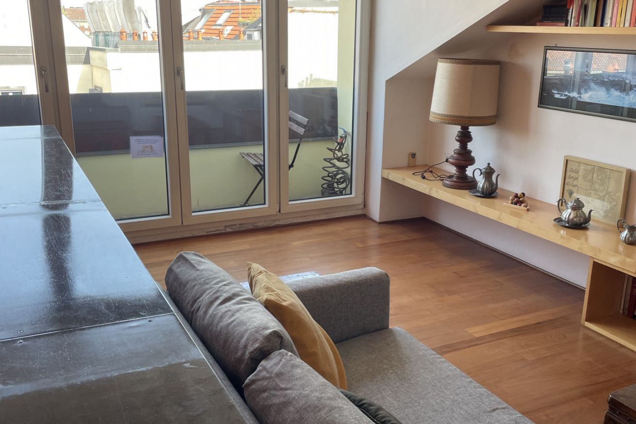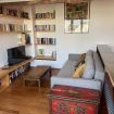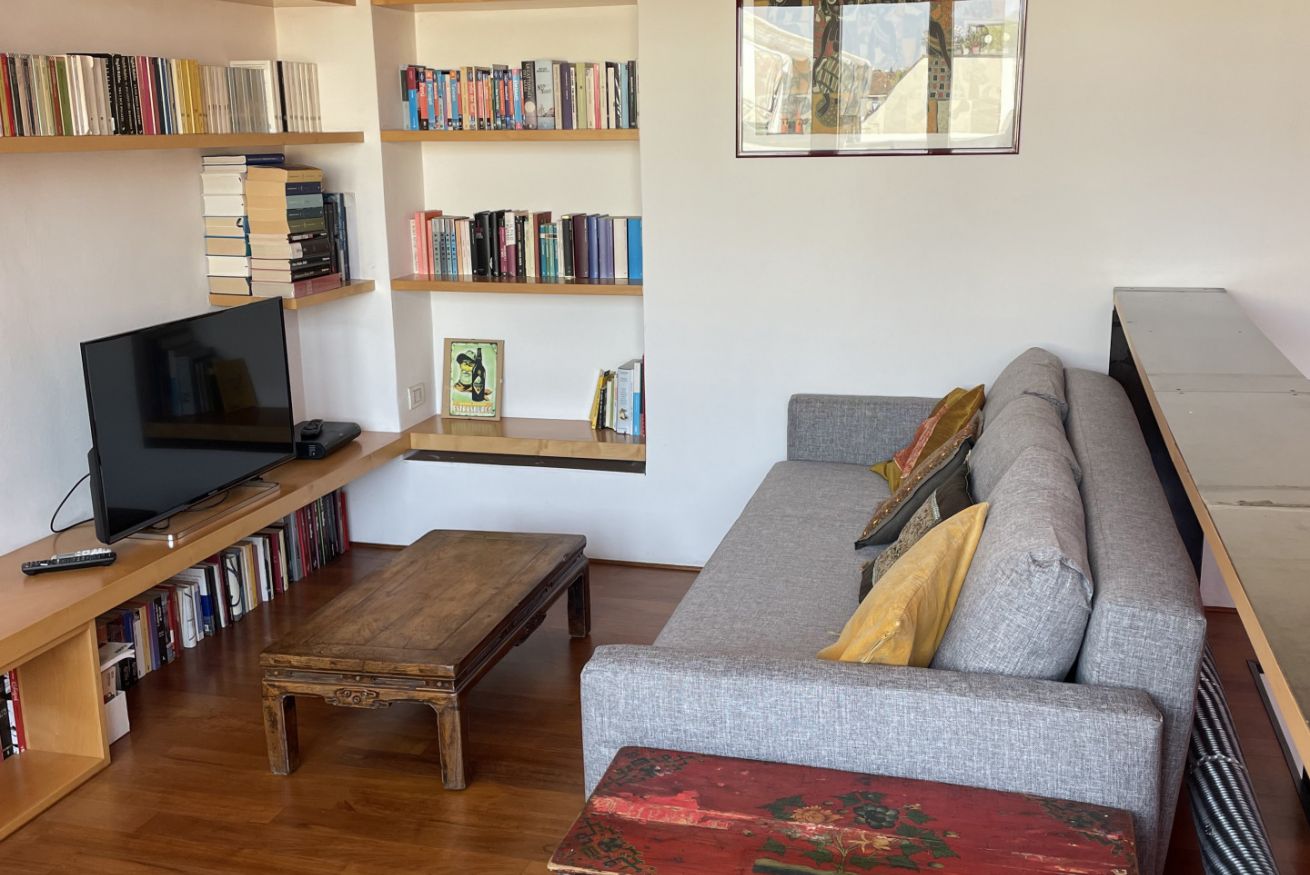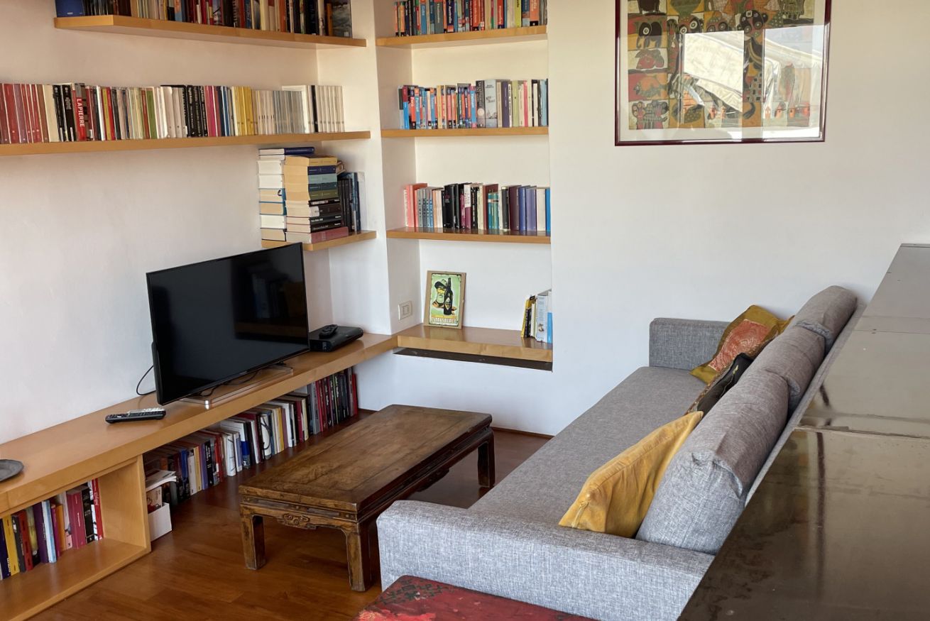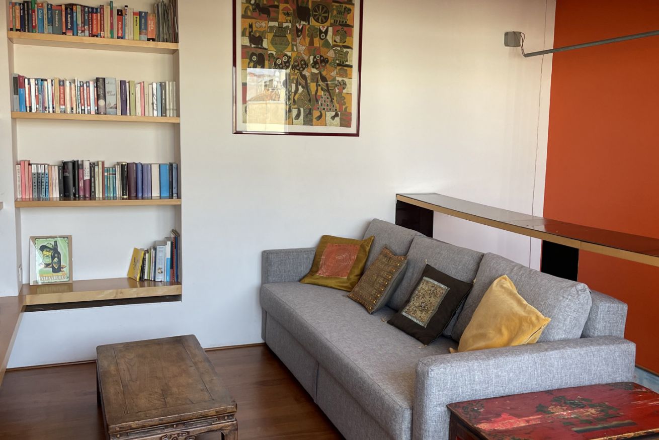 Salendo la scala interna, si accede al piano superiore dove si apre la zona giorno, un ambiente mansardato davvero accogliente, luminoso e con un tocco personale che lo rende unico. Qui, un grande divano invita al relax: che sia per guardare un film, sfogliare una rivista o semplicemente godersi un po’ di quiete. Per chi ama leggere, c'è anche una piccola libreria ben fornita: perfetta per una serata tranquilla.