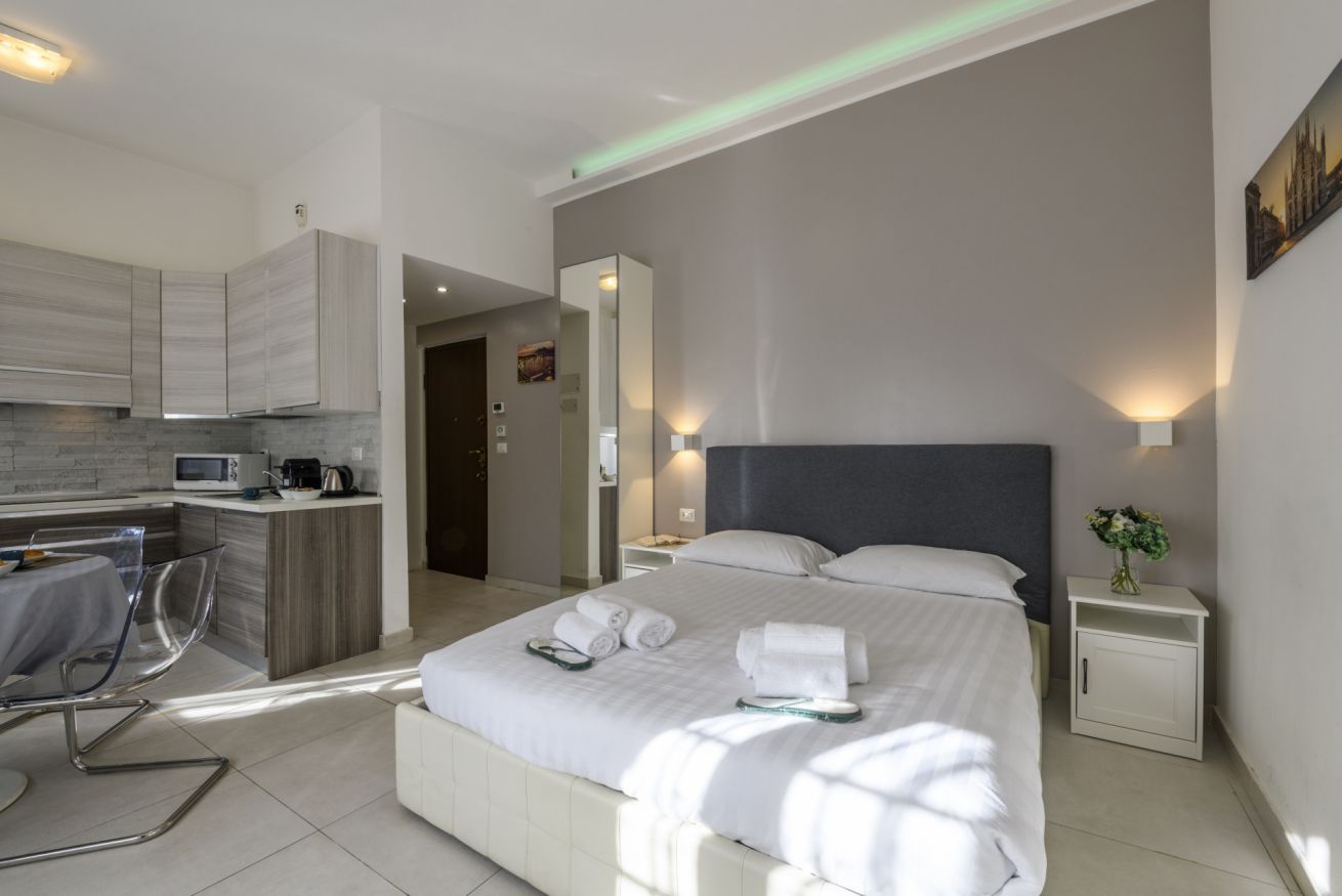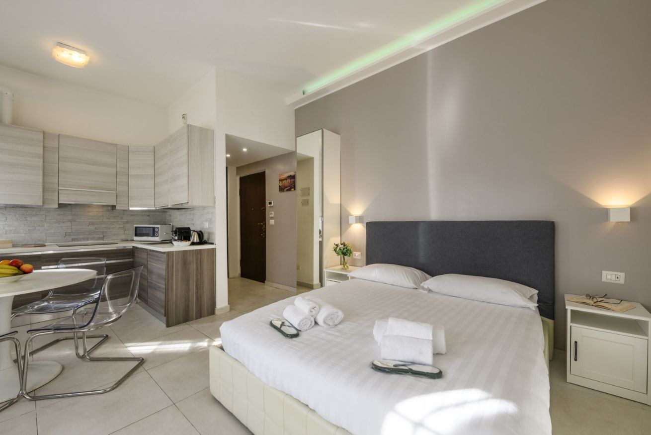 L’ingresso si apre su una luminosa zona giorno con cucina completamente attrezzata, dove troverete tutto il necessario per prepararvi un pasto in totale autonomia: piano cottura, forno a microonde, utensili, oltre a una macchina Nespresso e un pratico bollitore per iniziare la giornata con la vostra bevanda preferita. In questo ambiente si trova anche un comodo secondo letto matrimoniale, perfetto per ospitare fino a quattro persone senza rinunciare allo spazio.