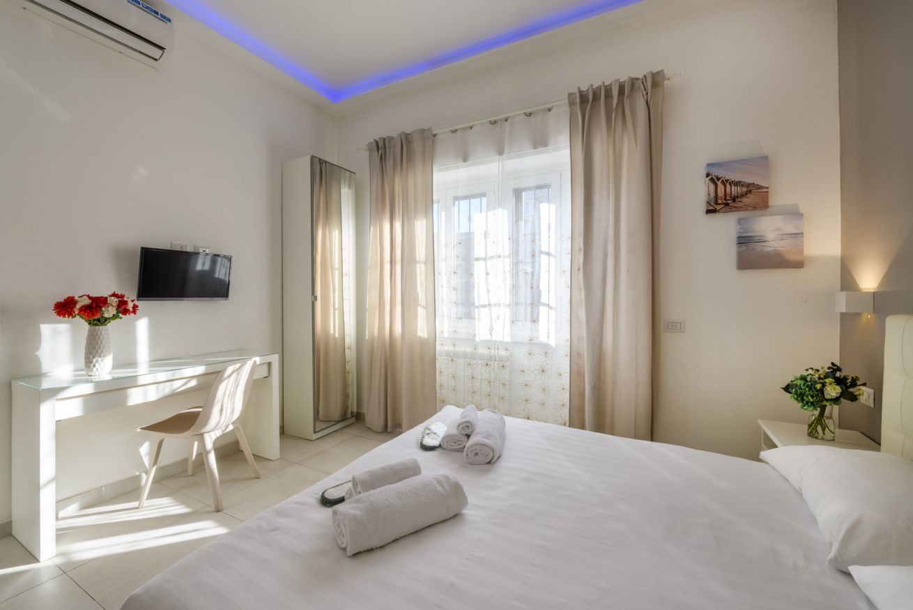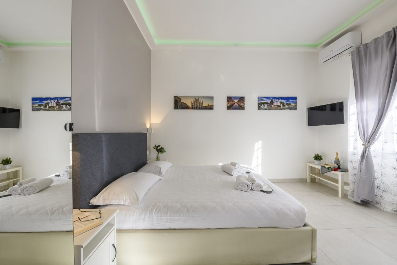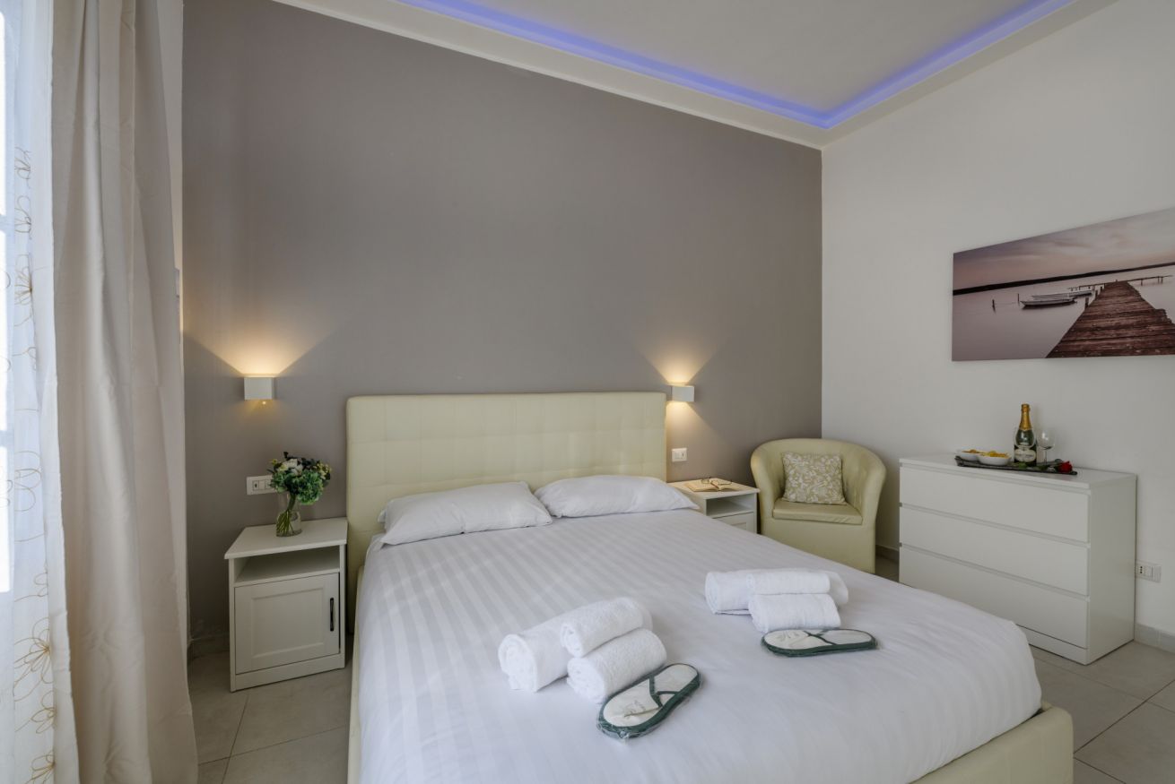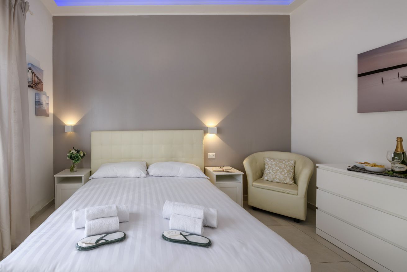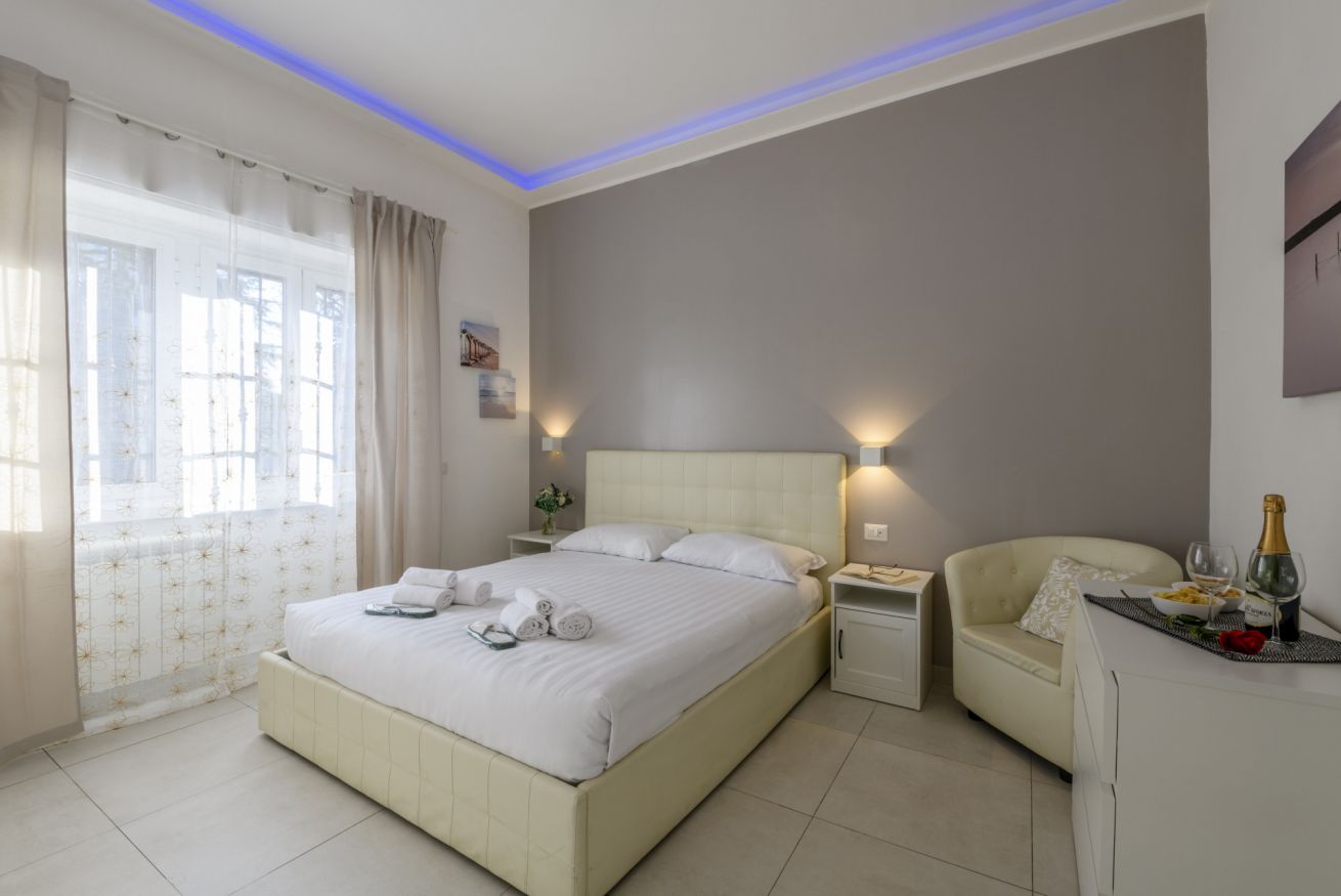 La camera da letto principale è arredata con un letto matrimoniale e offre un’atmosfera intima e rilassante, ideale per riposare dopo una giornata trascorsa a esplorare la città.