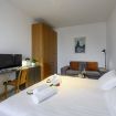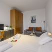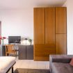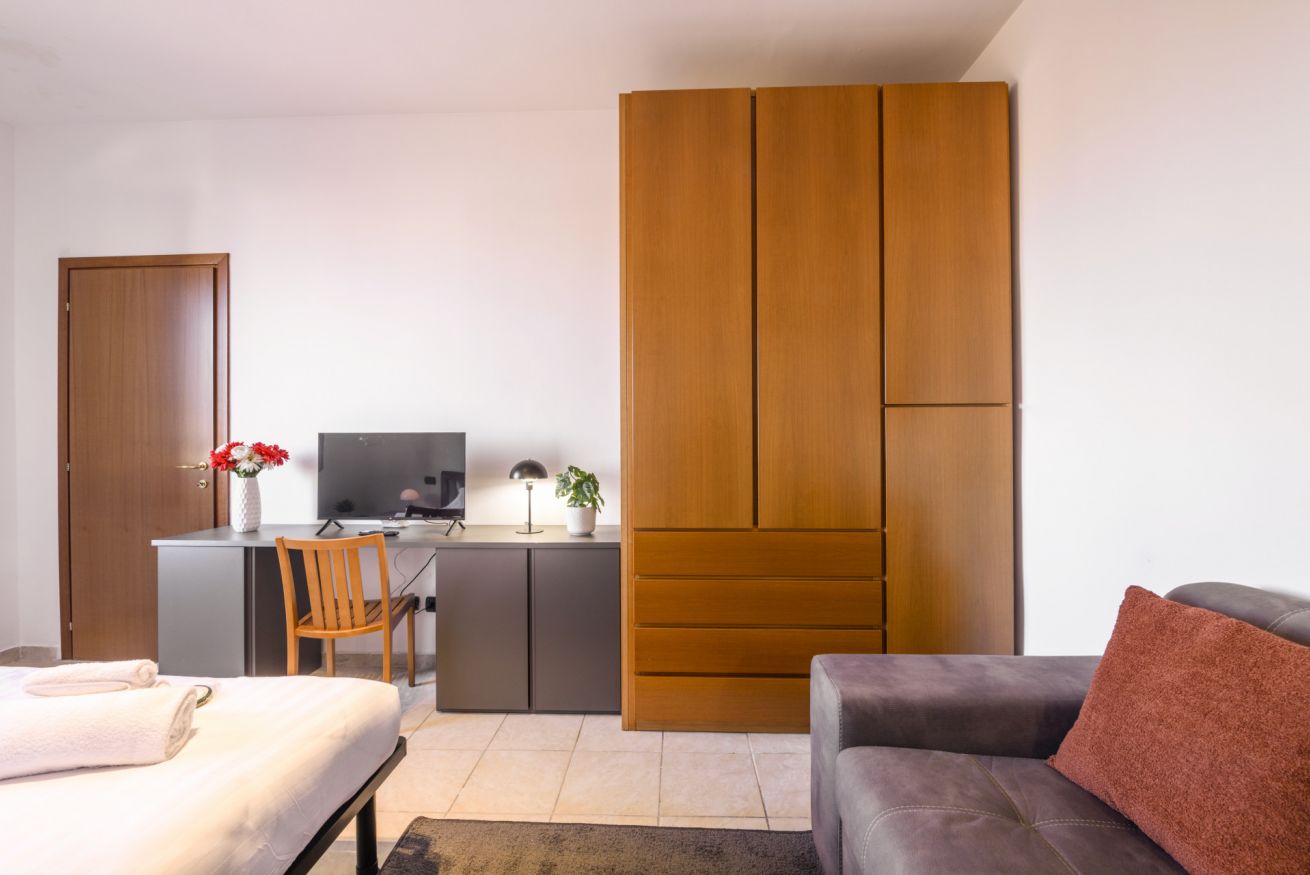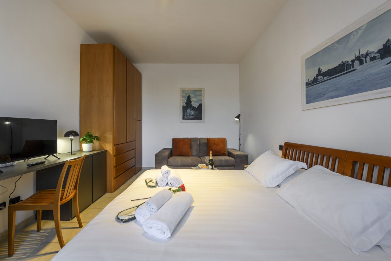 La camera da letto, accogliente e silenziosa, è arredata con un letto matrimoniale queen size e una capiente armadiatura con cassetti, perfetta per organizzare al meglio effetti personali e bagagli. A disposizione troverete anche una TV e un confortevole divano, ideale per leggere, rilassarsi o guardare un film dopo una giornata in città.