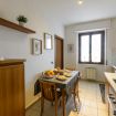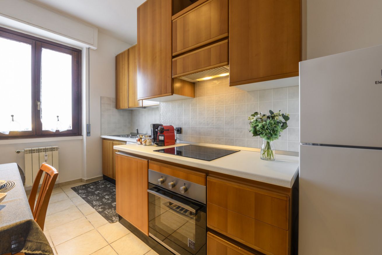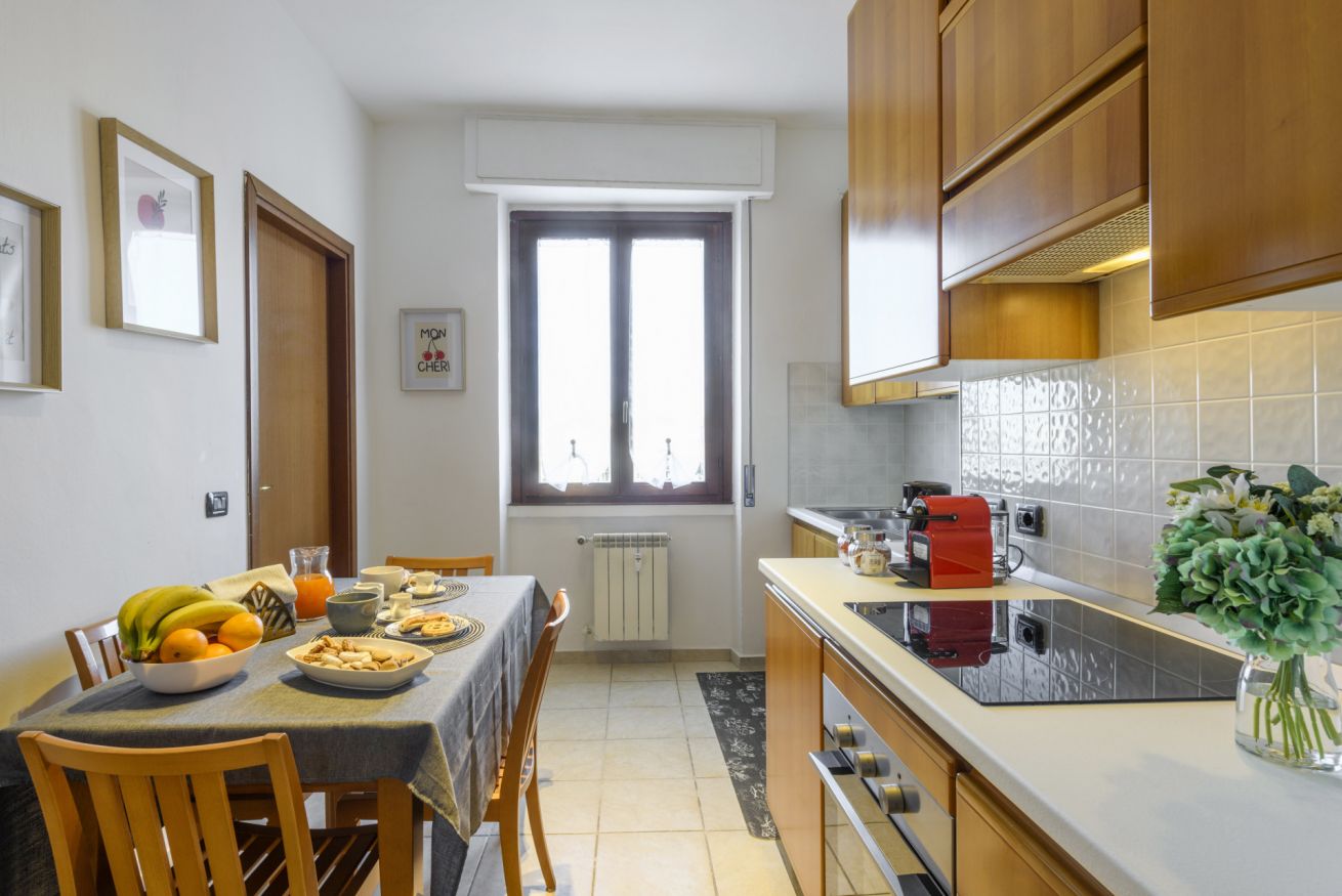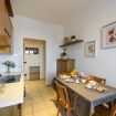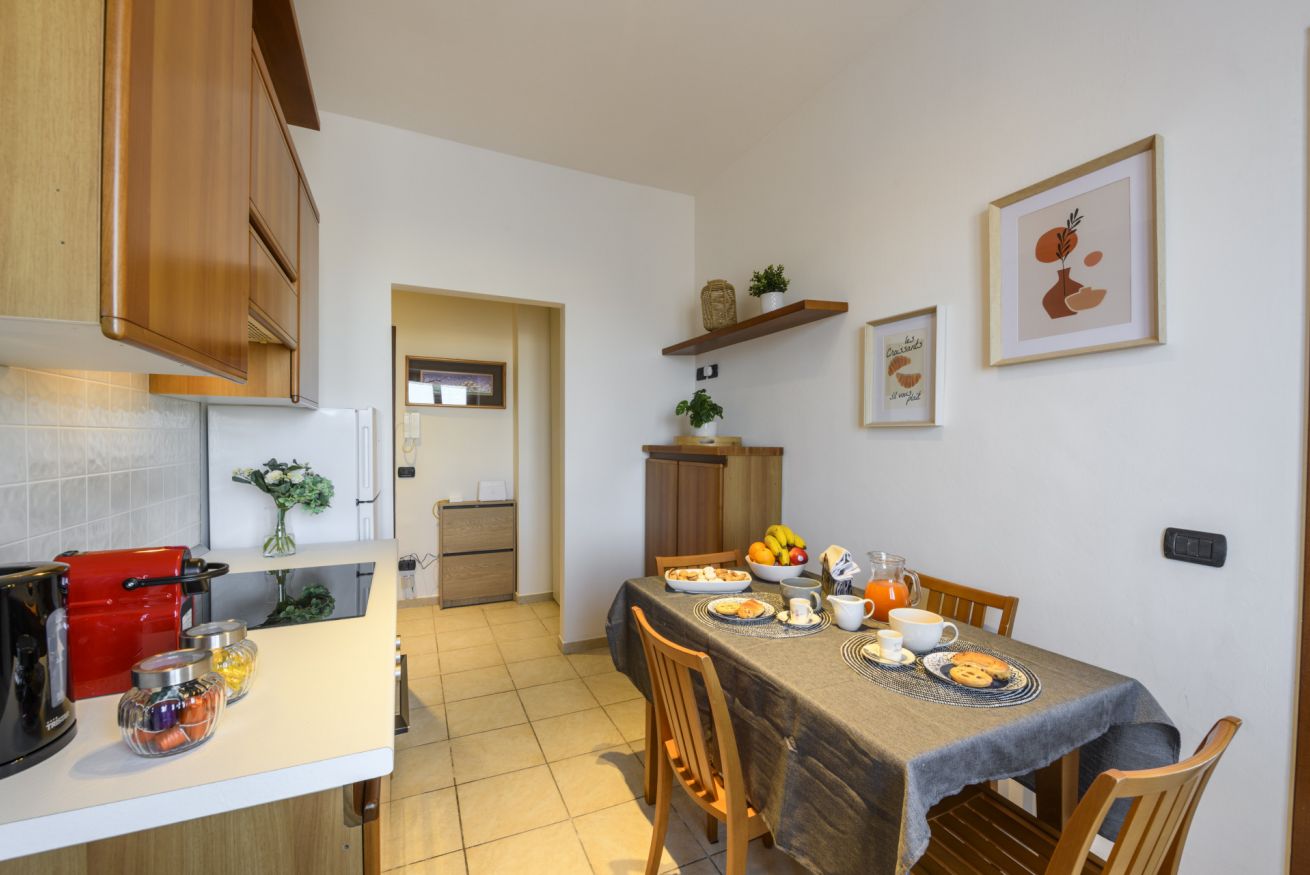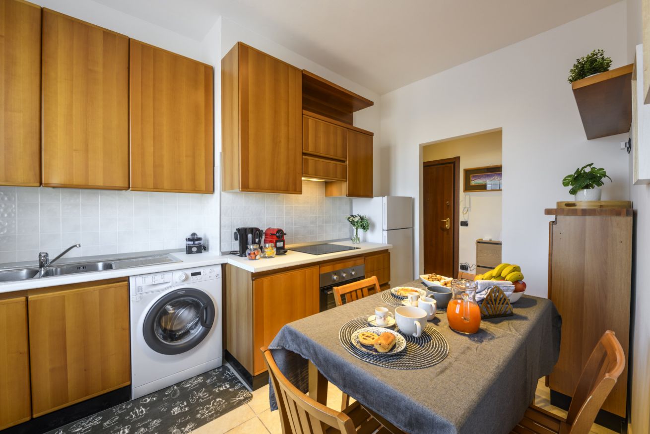 Dal disimpegno d’ingresso si accede alla cucina abitabile, spaziosa e funzionale, dotata di tutto il necessario (tranne la lavastoviglie) e completa di un comodo tavolo da pranzo ideale per consumare i pasti o lavorare in tranquillità. In questo ambiente è presente anche la lavatrice, molto utile per soggiorni più lunghi.