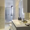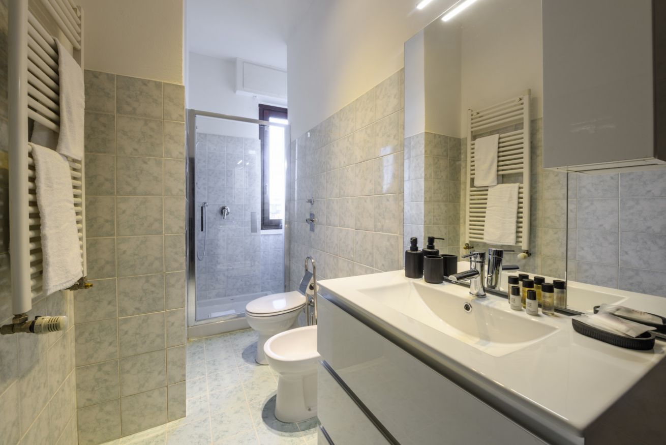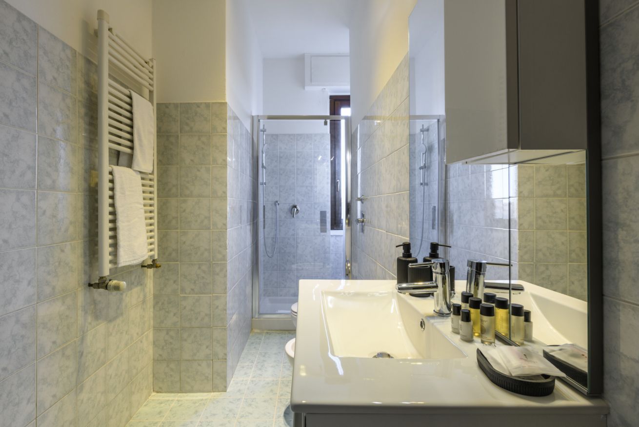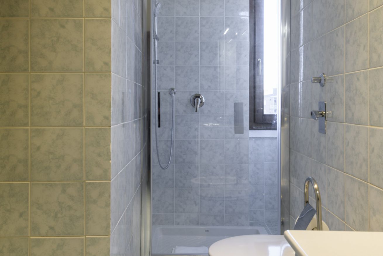 Il bagno, reso particolarmente piacevole dalla luce naturale proveniente dalla finestra, è dotato di un’ampia doccia e di tutto l’occorrente per un soggiorno confortevole.